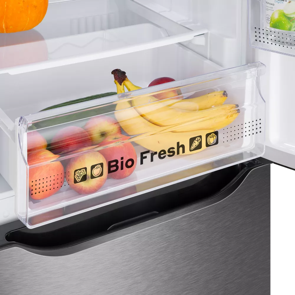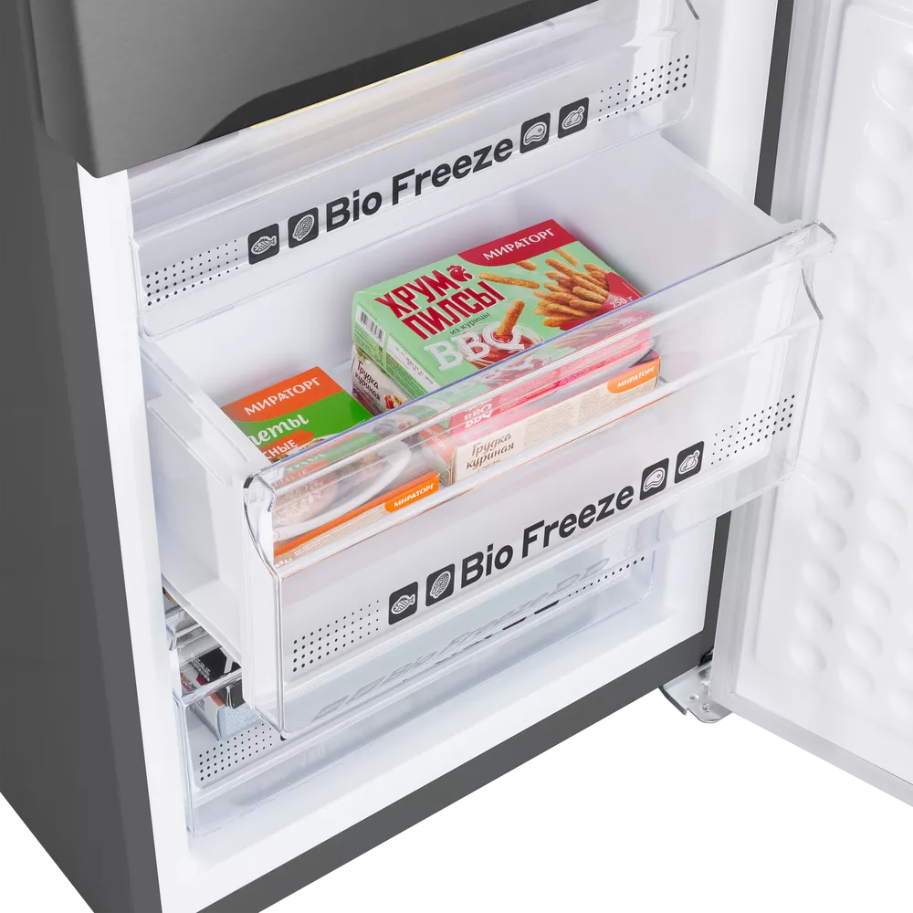 За долгую свежесть отвечает TOTAL No Frost, а инверторный компрессор обеспечивает тихую и плавную работу. Комфортную ежедневную эксплуатацию дополняют режимы Super Cool и Super Freezer, энергосберегающий Eco, а также «Отпуск», когда работает только морозильная камера. Низкий уровень шума 37 дБ делает MAUNFELD MFF195NFIX10 уместным даже на кухне-гостиной, а класс энергопотребления A+ помогает экономить электроэнергию.