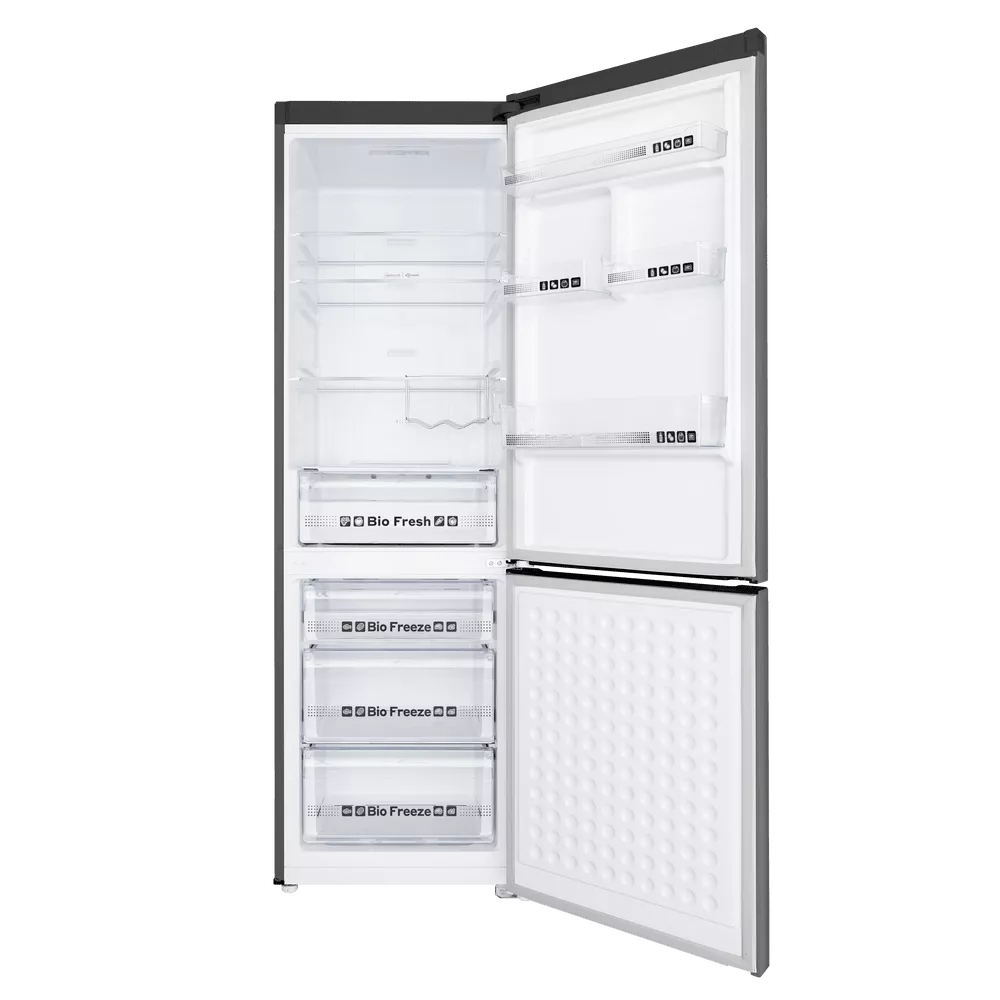 Верхняя холодильная камера объёмом 252 л продуманно разделена: стеклянные полки, большой ящик для фруктов и овощей, боковые полки на дверце и решётка для бутылок помогают поддерживать порядок. Морозильная камера на 98 л со стеклянной полкой и выдвижными ящиками ускоряет доступ к замороженным продуктам. Возможность перенавешивания двери добавляет гибкости при установке.
