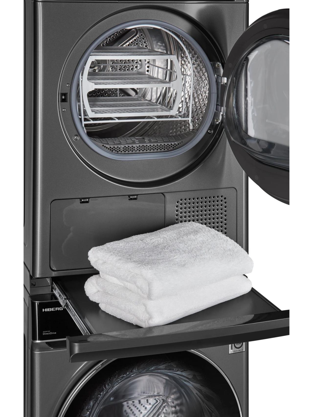 Комбинация «Сушильная машина HIBERG HDQ11 10 Sd + Стиральная машина HIBERG i-DDQ11 1014 Sd + соединительный элемент» от бренда HIBERG — удобное решение для семей, которым важно экономить место и время. Колонна устанавливается компактно и позволяет запускать два цикла одновременно, сохраняя единый стиль в темно-сером цвете.