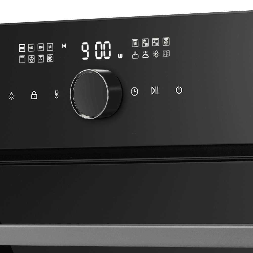 Трёхслойная дверца формирует «холодный фронт», делая процесс приготовления безопасным и исключая риск ожога при касании. Интуитивное сенсорное управление+поворотный переключатель с дисплеем позволяет легко выбирать режимы, время и температуру (35°–230°C), а также использовать таймер и блокировку от детей.