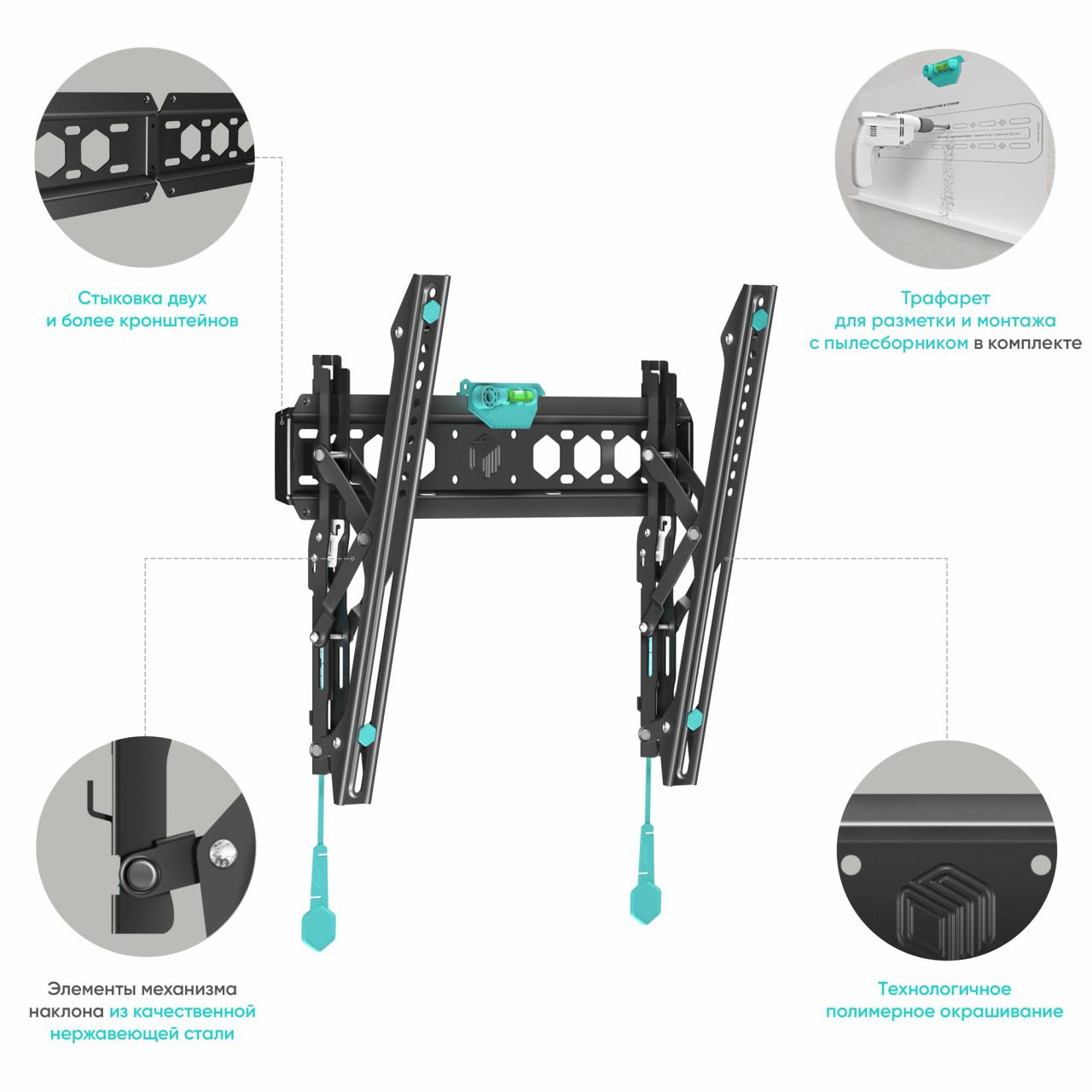 встроенный уровень; система фиксации "Просто щелчок"; материал: холоднокатаная сталь, SPCC class; производитель по результатам испытаний изменил диагональ и вес поддерживаемых телевизоров в большую сторону; производителем была изменена максимальная поддерживаемая диагональ с 55" до 65"; совместимость: кронштейн подходит для большинства телевизоров популярных брендов, среди которых Samsung, LG, Sony, KIVI, Tcl, Xiaomi Mi, SUPRA, Panasonic, Hyundai, Erisson, Asano, Horizont, JVC, Thomson, HARTENS, Sharp, Toshiba, Skyworth, BBK, AVEL, Витязь, Веко, BQ, DEXP, SkyLine, Pioneer, Rolsen, Harper, Hisense, Hitachi, Polarline, Prestigio, Telefunken и других