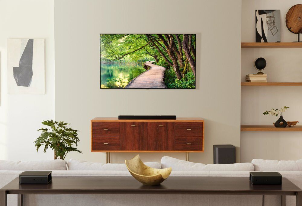 Акустический элемент звуковой панели: 6 овальных элементов размером 46 х 90 мм, 5 твитеров размером 20 мм (0,75 дюйма), 4 штуки, направленные вверх на 70 мм (2,75 дюйма) по всему аудиоэлементу.