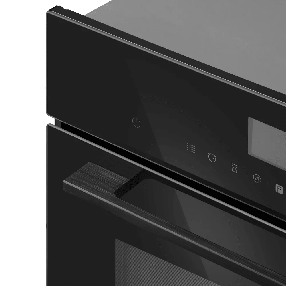 Дизайн с чёрным стеклом и эргономичной ручкой гармонично впишется в современную кухню и будет сочетаться с другой техникой. В комплекте предусмотрены противни, решётка и хромированные направляющие — всё для удобного старта и повседневной готовки.