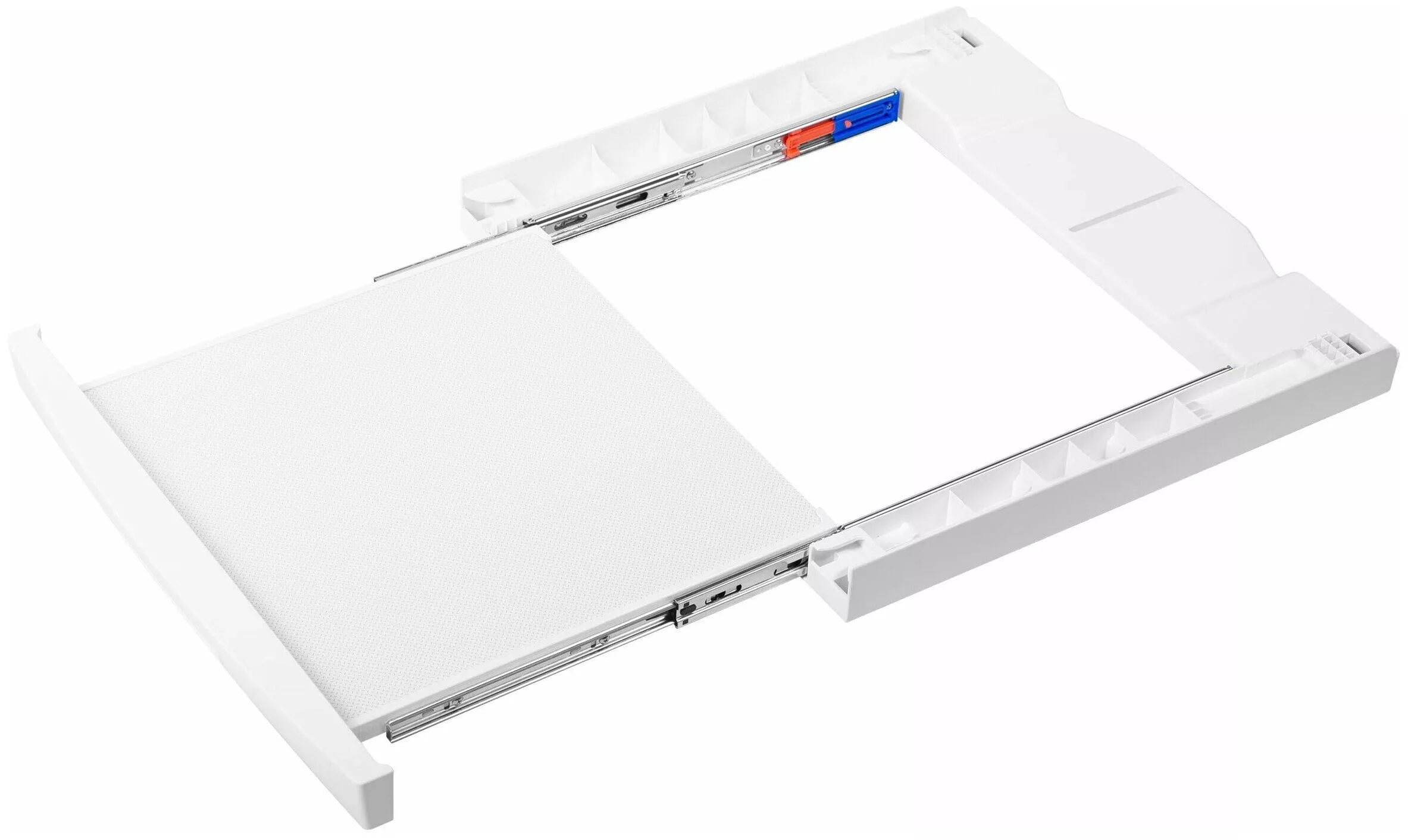Благодаря выдвижной полке с автоматическими доводчиками больше не придется постоянно наклоняться к корзине с бельем или держать ее на весу при разгрузке сушильной машины, достаточно просто поставить корзину на полку.