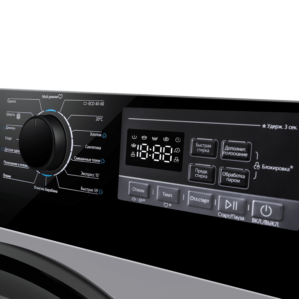 Сохраните любимые настройки в программе «Мой режим»: установите температуру, скорость отжима и дополнительные функции — затем запускайте цикл одним поворотом регулятора. Электронное управление и понятный дисплей помогают контролировать процесс, а индикация этапов всегда показывает текущую фазу стирки.
