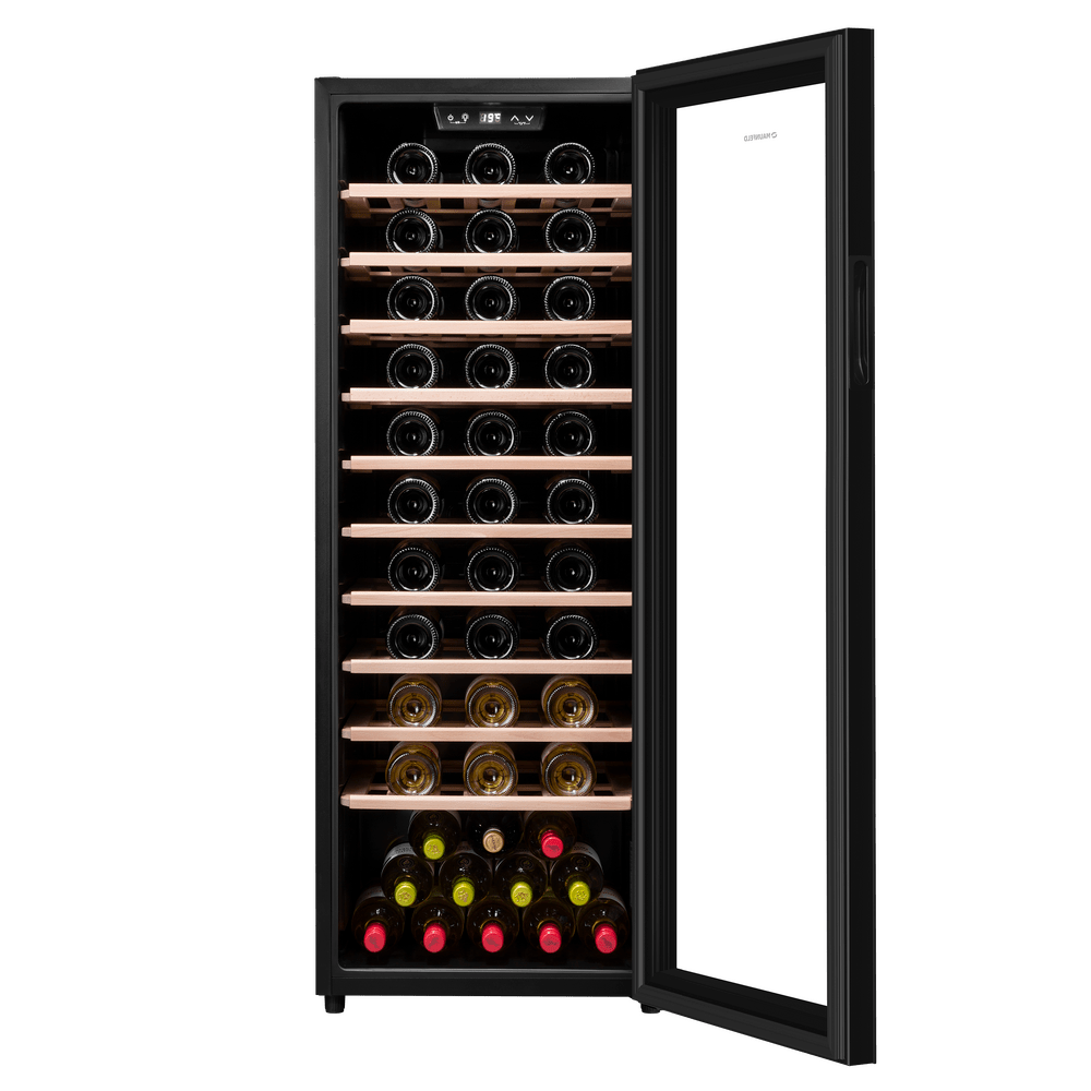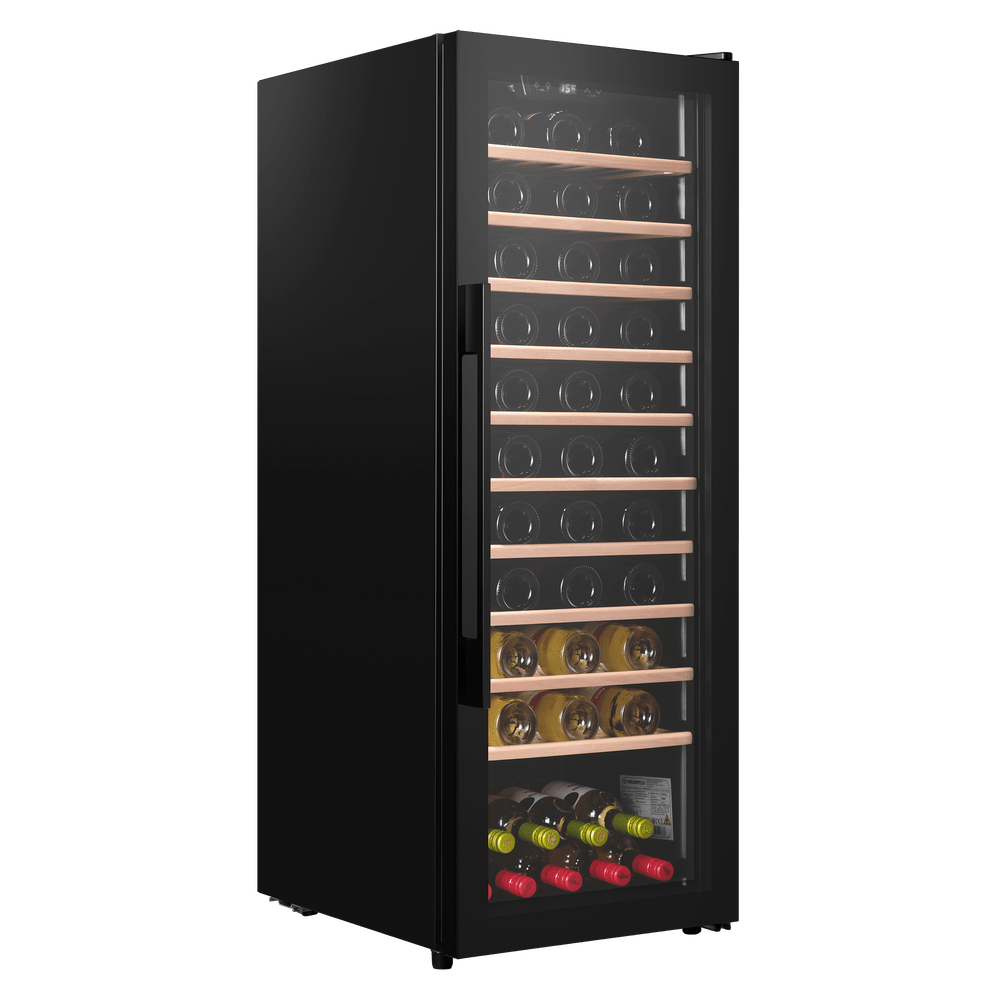 Дверца из тонированного стекла с защитой от УФ-излучения сохраняет напитки, а компрессорное охлаждение стабильно поддерживает условия хранения при влажности 50–80 %.