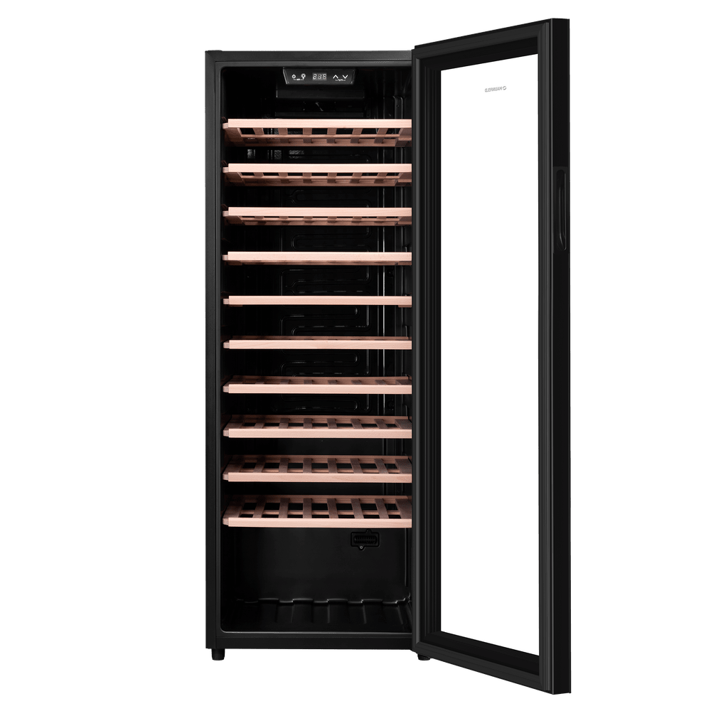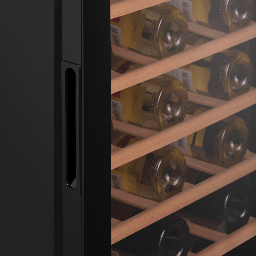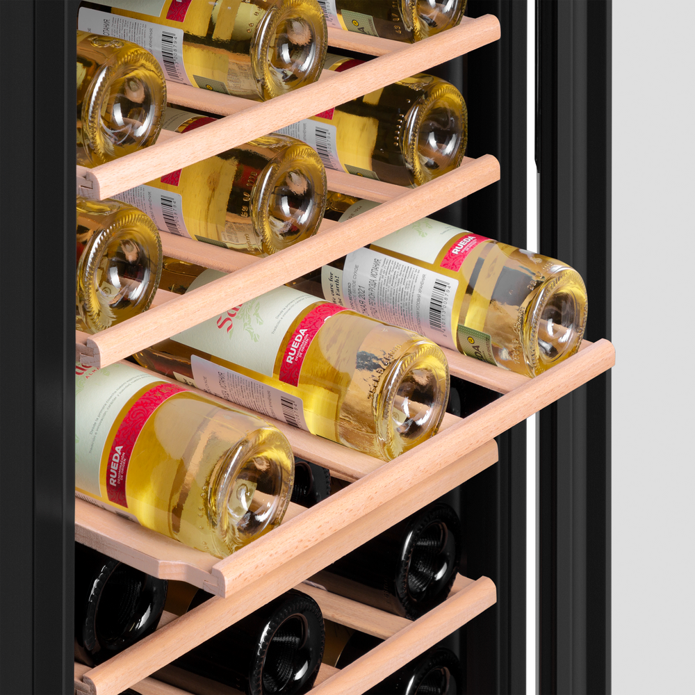 Продуманная компоновка обеспечивает вместимость до 84 бутылок: 10 прочных полок из массива бука удобно размещают бутылки, при необходимости полку можно извлечь и переорганизовать пространство. Светодиодная подсветка мягко подсвечивает этикетки.
