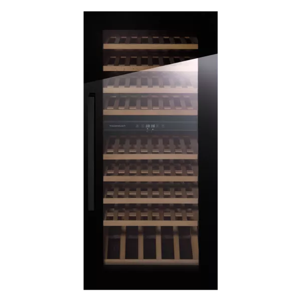 Встраиваемый винный шкаф Kuppersbusch FWK 4800.0 S5 Black Velvet из премиальной серии K.8 — это элегантное и современное решение для хранения и созревания вин, сочетающее изысканный дизайн и передовые технологии. Модель выполнена в черном стекле с уникальным дизайном Black Velvet (черный бархат) и фурнитурой черный хром, что придает ей сдержанный и премиальный вид . Вместимость составляет 79 бутылок, размещенных на 9 деревянных полках . Электронная система управления с цифровым дисплеем и нажимными кнопками обеспечивает точный контроль температуры в диапазоне 5–18 °C в двух независимых отделениях. Инновационная система охлаждения с динамической циркуляцией воздуха гарантирует равномерное распределение температуры и влажности по всему объему. Резервуар для воды обеспечивает дополнительное увлажнение, создавая идеальные условия для длительного хранения вин. LED-освещение деликатно подсвечивает коллекцию без нагрева . Шкаф оснащен полным набором сигнализаций: звуковой сигнал, световая индикация аварии, индикация температуры внутри и снаружи. Изменяемая навеска двери (угол открывания 90°) позволяет адаптировать установку под планировку. Низкий уровень шума 39 дБ обеспечивает комфортную эксплуатацию . Производство — бренд из Германии.