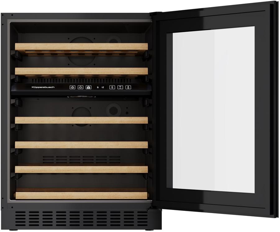 Встраиваемый винный шкаф Kuppersbusch FWKU 1851.0 S — это стильное и вместительное решение для хранения и созревания вин, созданное для ценителей качества и элегантности. Модель выполнена в черном стекле с элегантной черной рамкой, что придает ей современный и изысканный вид. Скрытая ручка не нарушает гармоничность внешнего облика, а возможность перенавешивания двери позволяет легко адаптировать установку под планировку помещения. Высота корпуса регулируется в пределах 81,5–88,5 см, ширина 59,5 см, глубина 57 см. Для установки под столешницу предусмотрена съемная вентиляционная решетка.